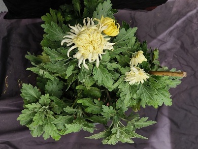 B黄莲羹是独本菊,花为淡黄色,瓣型为平瓣,花型为荷花型,具有较强的抗潜叶蝇性,但抗蚜虫性较弱,观赏持续期较短。