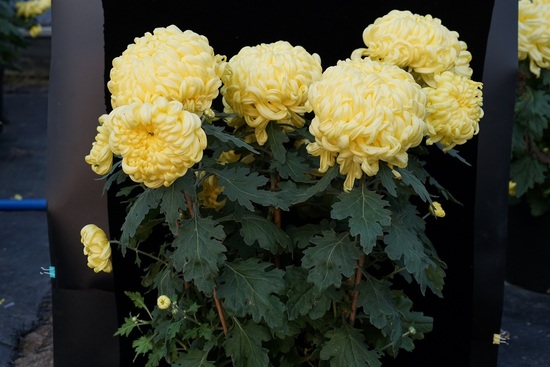 黄球是独本菊,花为浅黄色,瓣型为平瓣,花型为叠球型,具有中等的抗蚜虫性和较强的抗潜叶蝇性,观赏持续期较长。