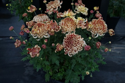 泥金匙球是独本菊,花为橙红色,瓣型为平瓣,花型为芍药型,具有较强的抗蚜虫性和中等的抗潜叶蝇性,观赏持续期较长。