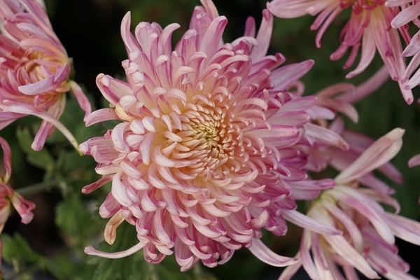 玉堂の春是独本菊,花为浅粉色,瓣型为管瓣,花型为翎管型,具有较强的抗蚜虫性和抗潜叶蝇性,观赏持续期较长。