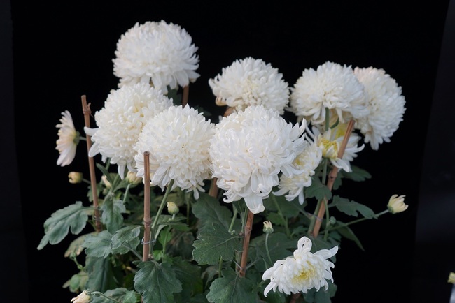 倾国倾城是独本菊,花为白色,瓣型为平瓣,花型为芍药型,具有较强的抗蚜虫性和中等的抗潜叶蝇性,观赏持续期较短。