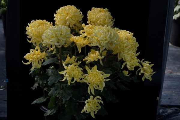 国华の林是独本菊,花为浅黄色,瓣型为平瓣,花型为叠球型,具有较强的抗蚜虫性,但抗潜叶蝇性较弱,观赏持续期较长。