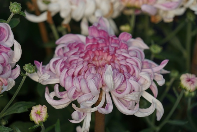 榄山宫粉是独本菊,花为粉红色,瓣型为平瓣,花型为芍药型,具有较强的抗蚜虫性和抗潜叶蝇性,观赏持续期较短。